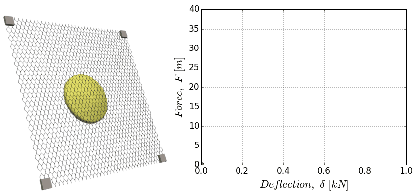 The red point represents the maximum value of the normal force and the corresponding deflection of the mesh panel. At this point, the wire mesh could break close to the punching element ("Block-punching mechanism") or to the anchor plates ("Anchor-punching mechanism") depending on the relative size of the two elements.
